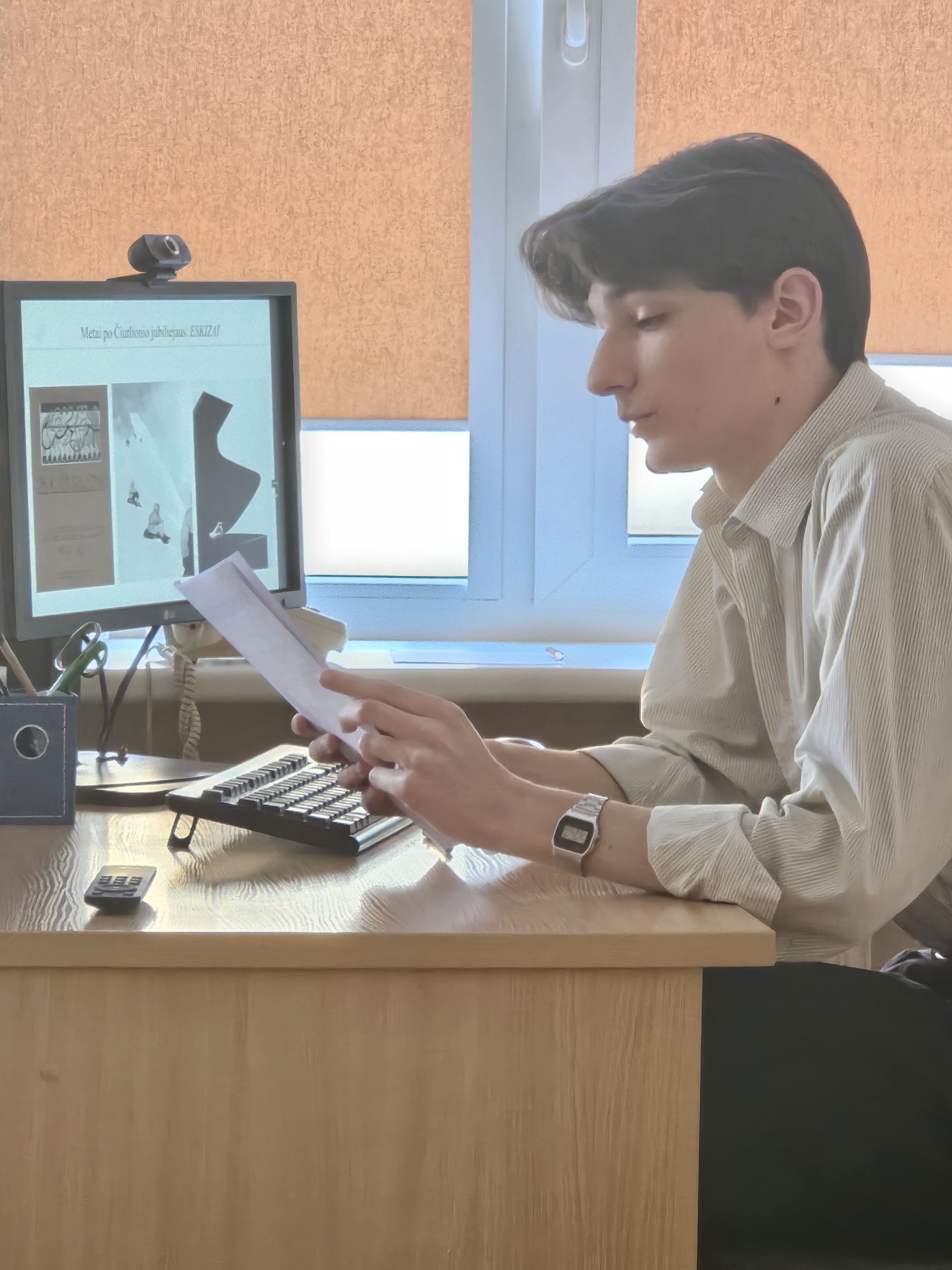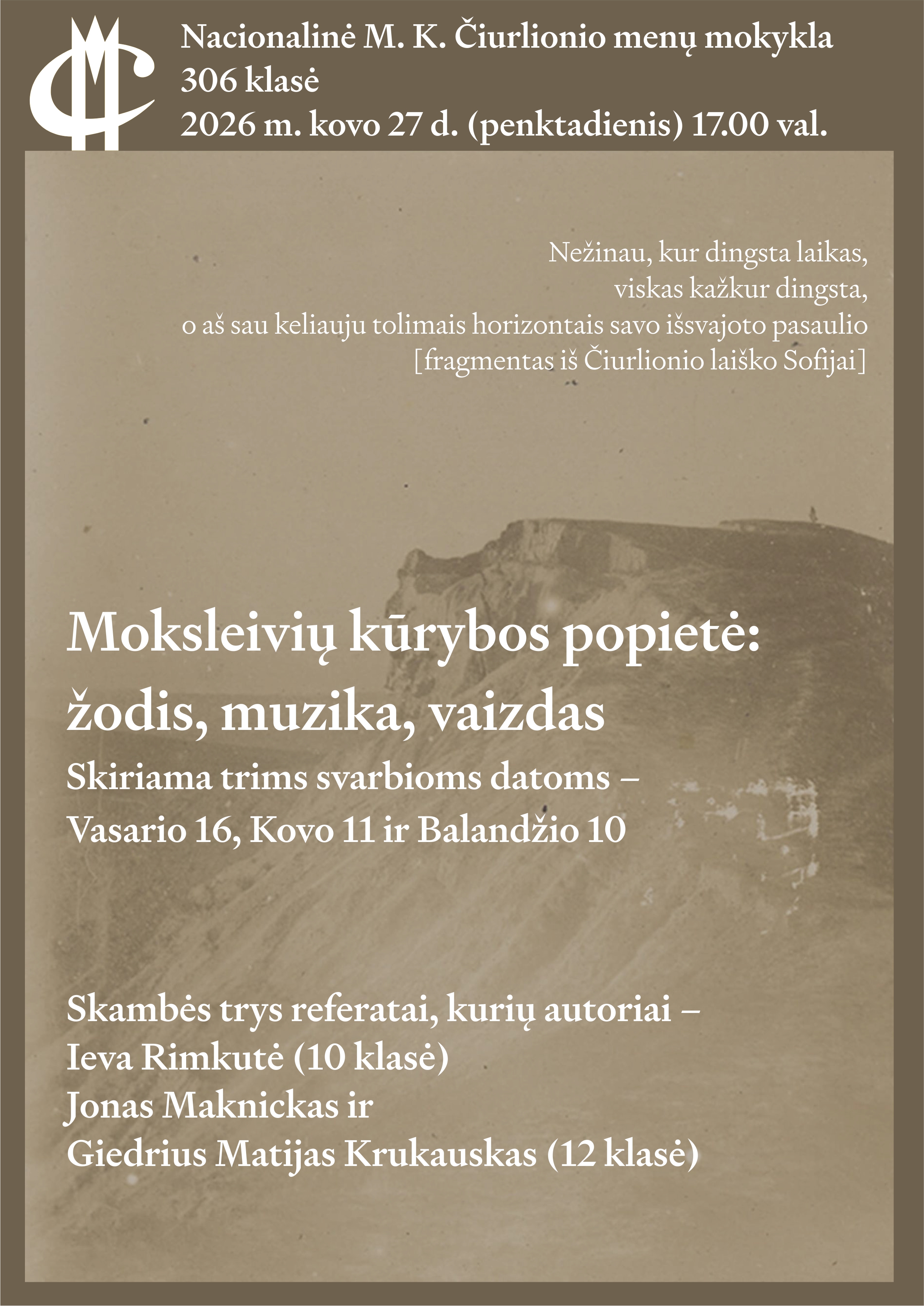 Jau susidaro metų tėkmė, kai kasmet pavasarį mūsų mokykloje, dažniausiai 306 klasėje, įvyksta Referatų popietė, dalyvaujant kompozicijos ir muzikos istorijos bei teorijos skyriaus moksleiviams. Šįmet tai atsitiko kovo 27 d., o renginys, kaip įprasta, buvo paskirtas trims svarbioms datoms – Vasario 16, Kovo 11 ir Balandžio 10. Pastaroji – Čiurlionio mirties diena. O ir Čiurlionio tema šiuose renginiuose bemaž visada aktuali – arba tiesiogiai, arba potekstėje.