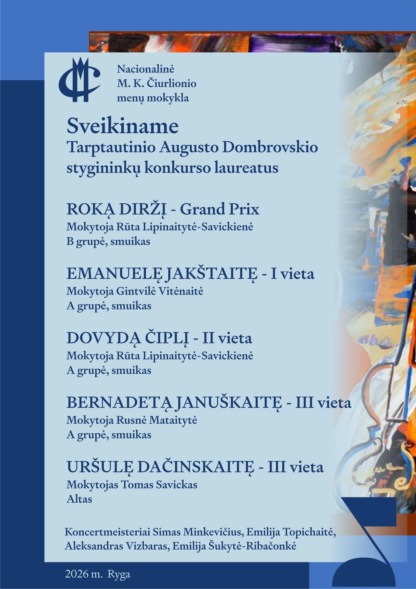 Nuoširdžiai sveikiname mūsų čiurlioniukus, X tarptautinio Augusto Dombrovskio stygininkų konkurso (Ryga) nugalėtojus: