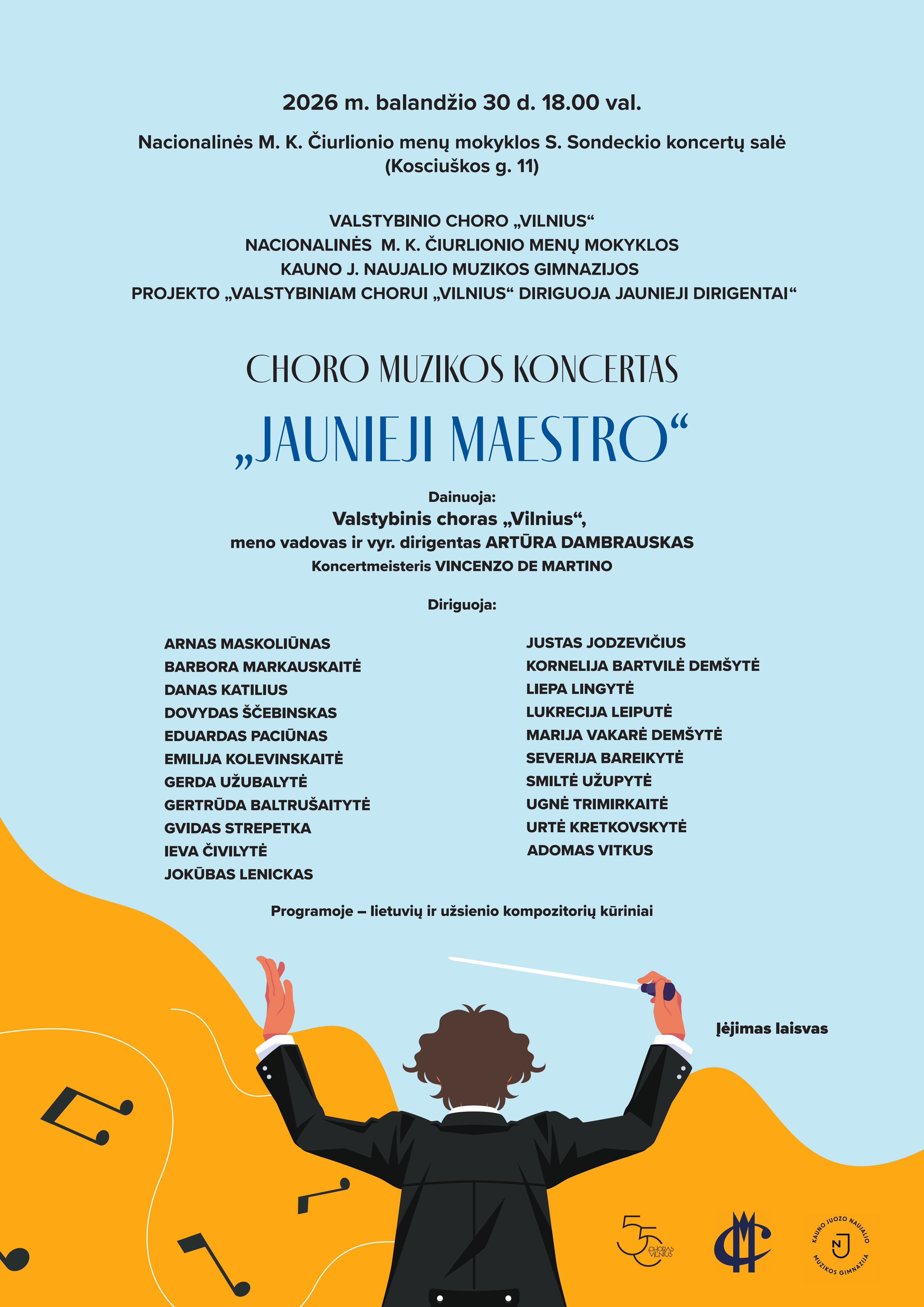 2026 m. balandžio 30 d. 18.00 val. maloniai kviečiame į baigiamąjį projekto „Jaunieji maestro“ koncertą Nacionalinės M. K. Čiurlionio menų mokyklos S. Sondeckio koncertų salėje (T. Kosciuškos g. 11, Vilnius), kuriame Valstybiniam chorui „Vilnius“ diriguos jaunieji dirigentai.
