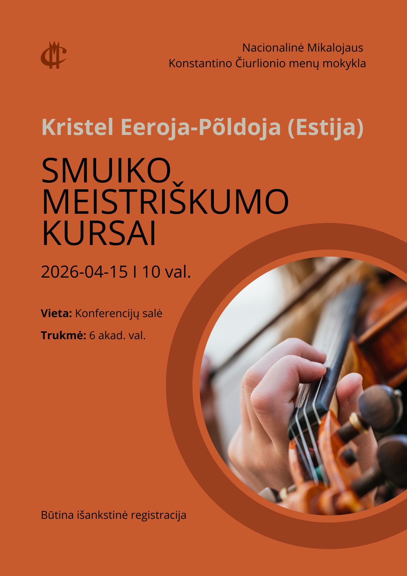 2026 m. balandžio 15 d. 10 val. Nacionalinės M. K. Čiurlionio menų mokyklos Konferencijų salėje (T. Kosciuškos g. 11, Vilnius) vyks smuikininkės, pedagogės ir orkestrų koncertmeisterės Kristel Eeroja-Põldoja (Estija) smuiko meistriškumo kursai.