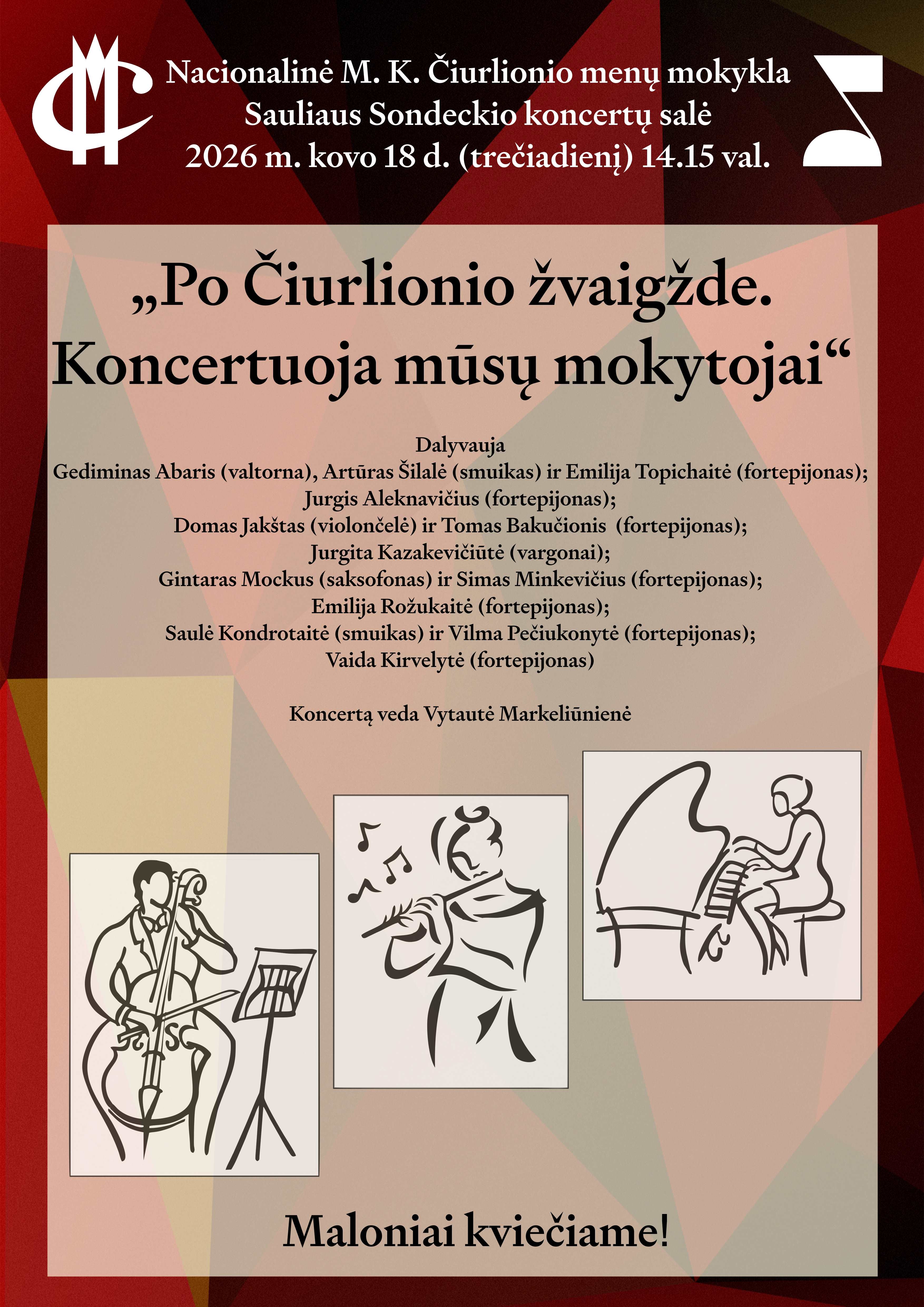 2026 m. kovo 18 d. 14.15 val. maloniai kviečiame į NČMM Sauliaus Sondeckio koncertų salę (T.Kosciuškos g. 11, Vilnius) į koncertą „PO ČIURLIONIO ŽVAIGŽDE. KONCERTUOJA MŪSŲ MOKYTOJAI“. Koncertą veda Vytautė Markeliūnienė.