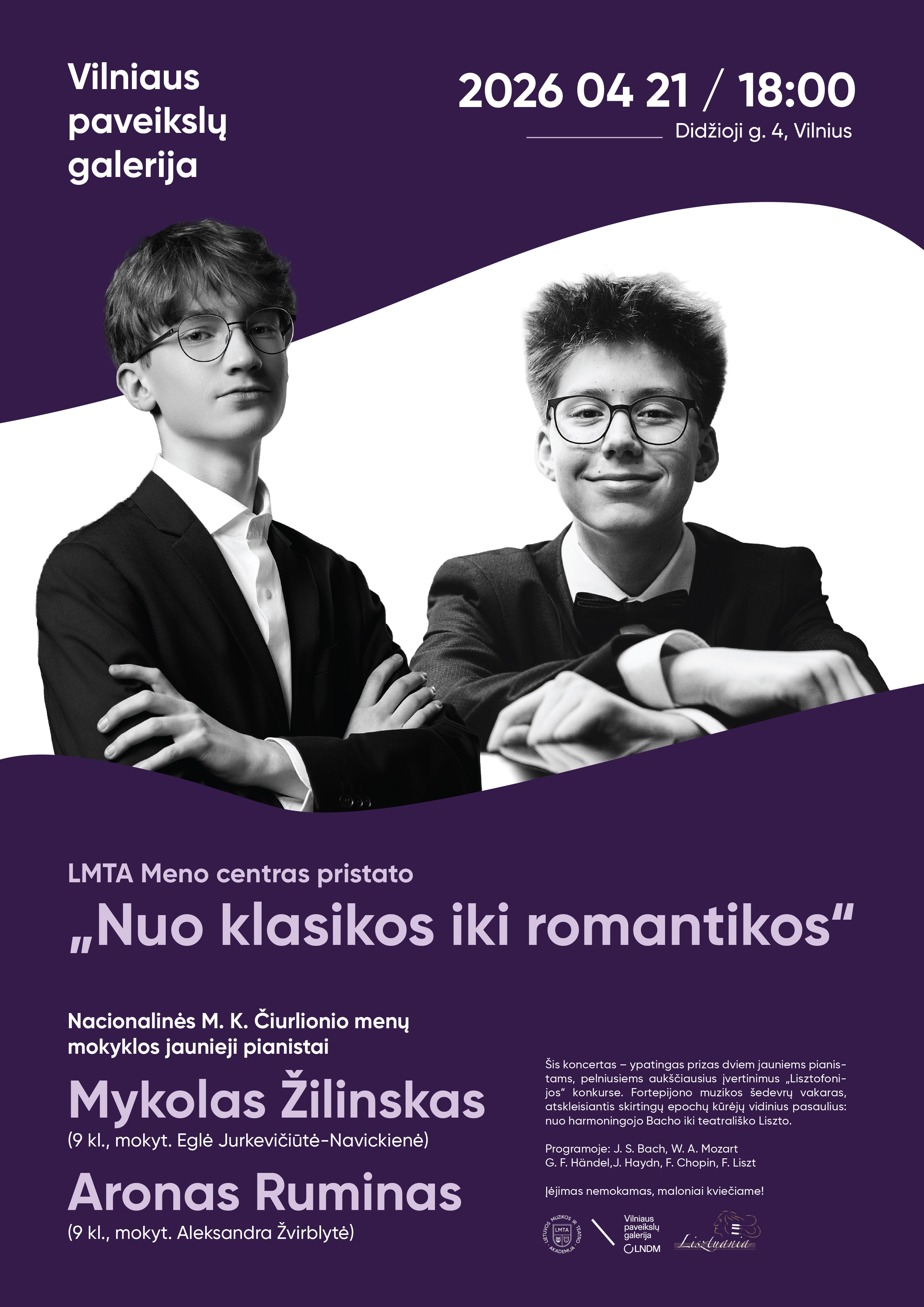 2026 m. balandžio 21 d. 18.00 val. Vilniaus Paveikslų galerijoje (Didžioji g. 4, Vilnius) vyks LISZTOFONIJOS konkurso laureatų, jaunųjų pianistų, čiurlioniukų MYKOLO ŽILINSKO ir ARONO RUMINO koncertas „NUO KLASIKOS IKI ROMANTIKOS“. Koncertas nemokamas.