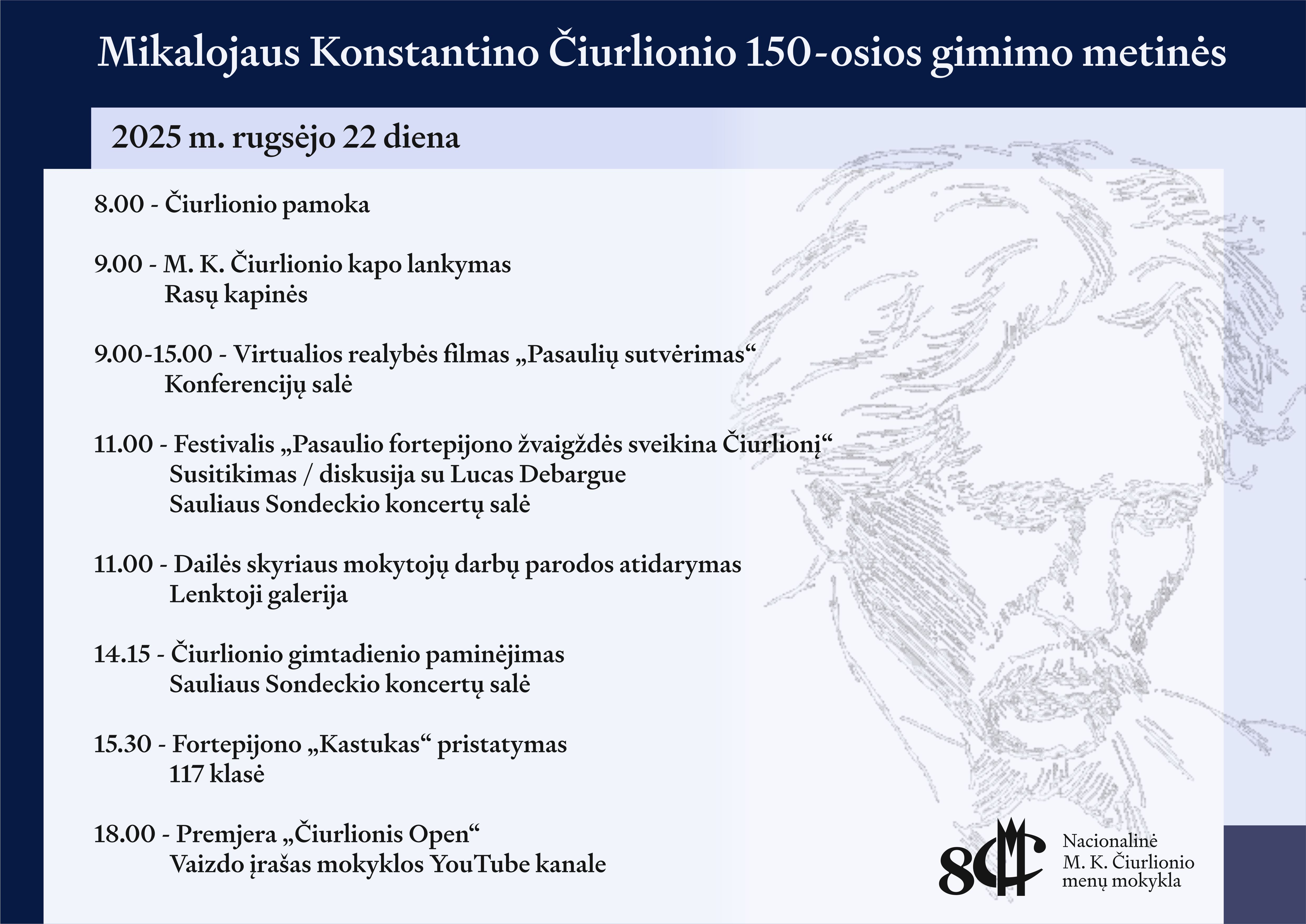Nacionalinės M.K. Čiurlionio menų mokyklos Mikalojas Konstantino Čiurlionio 150-ųjų gimimo metinių rengiunų programa 2025 m. rugsėjo 22 d. Čiulionija sveikina: su gimtadieniu, Konstantinai!