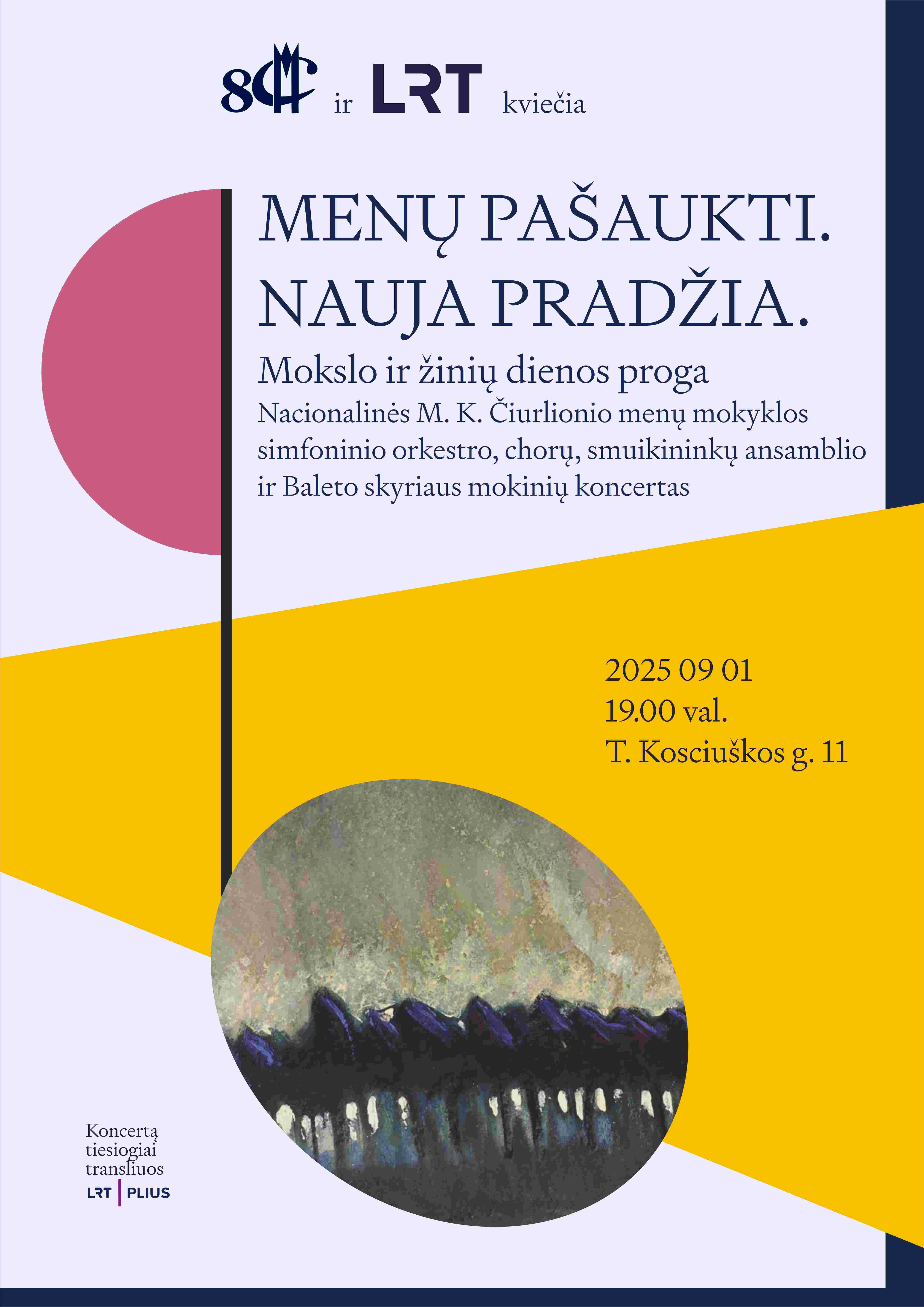 Nacionalinė M. K. Čiurlionio menų mokykla kviečia 2025 m. rugsėjo 1 d. 19.00 val. į Mokslo ir žinių dienos koncertą „MENŲ PAŠAUKTI. NAUJA PRADŽIA“ Nacionalinės M. K. Čiurlionio menų mokyklos kiemelyje (T. Kostiuškos g. 11). Renginį tiesiogiai transliuos LRT PLIUS. Koncertą veda Gerūta Griniūtė, Teodoras Lipčius, Pranciškus Kurauskas