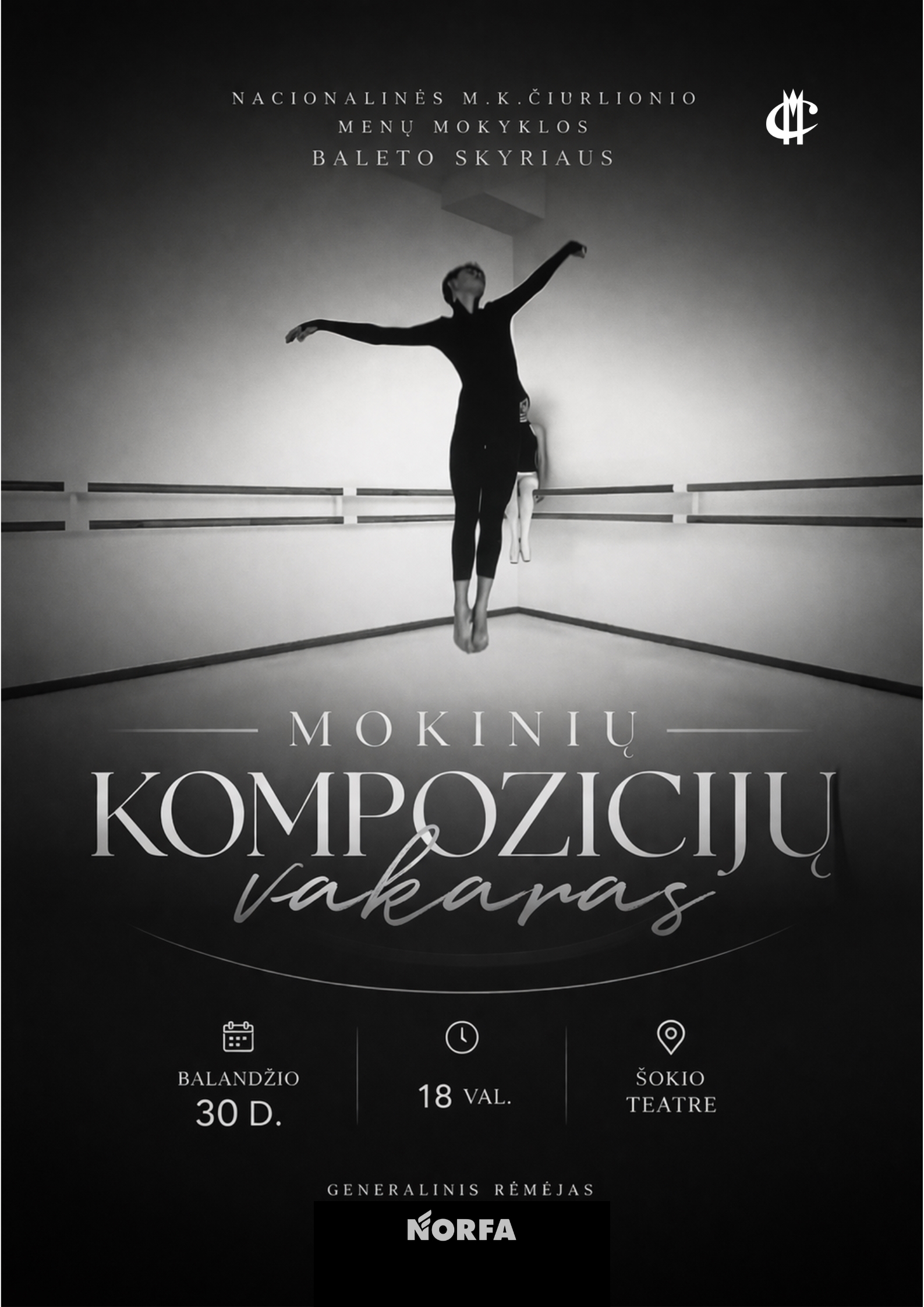 2026 m. balandžio 30 d. 18.00 val. maloniai kviečiame į Nacionalinės M. K. Čiurlionio menų mokyklos baleto skyriaus „MOKINIŲ KOMPOZICIJŲ VAKARĄ“ Šokio teatre (T. Kosciuškos g. 11, Vilnius).