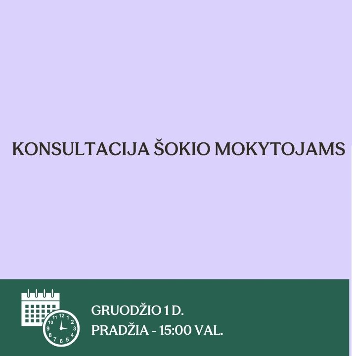 Konsultacijos tikslas – suteikti šokio mokytojams ir meno pedagogams žinių bei praktinių įžvalgų apie šokio reiškinių ir kontekstų pažinimo įgyvendinimą pagal atnaujintas bendrąsias programas, analizuojant kūrybinius procesus, skirtingas šokio formas ir jų raišką.