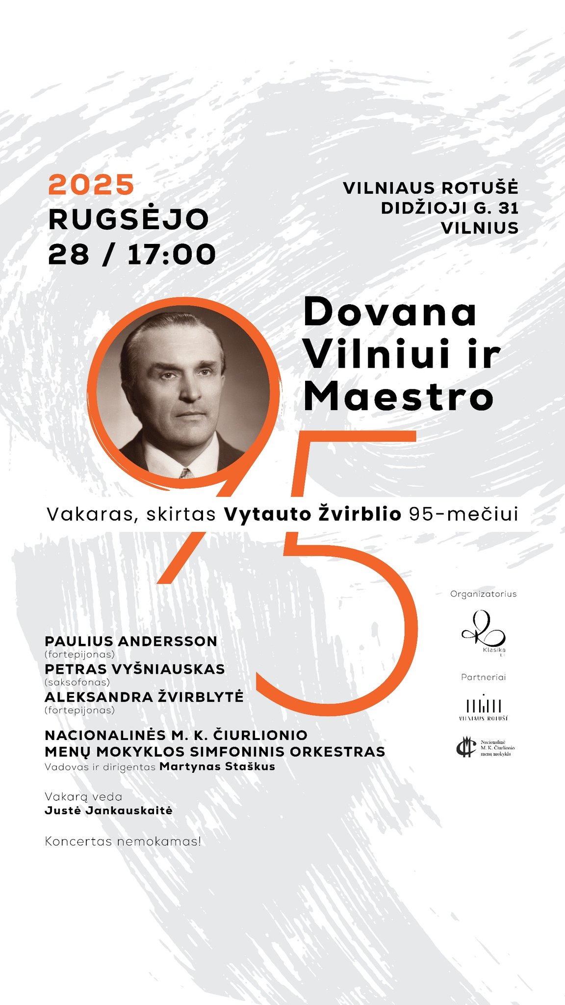 2025 m. rugsėjo 28 d. 17.00 val. Vilniaus rotušėje (Didžioji g. 31, Vilnius) Nacionalinės M. K. Čiurlionio menų mokyklos simfoninins orkestras gros vakare, skirtame maestro Vytauto Žvirblio 95-mečiui, „DOVANA VILNIUI IR MAESTRO„. Įėjimas laisvas.