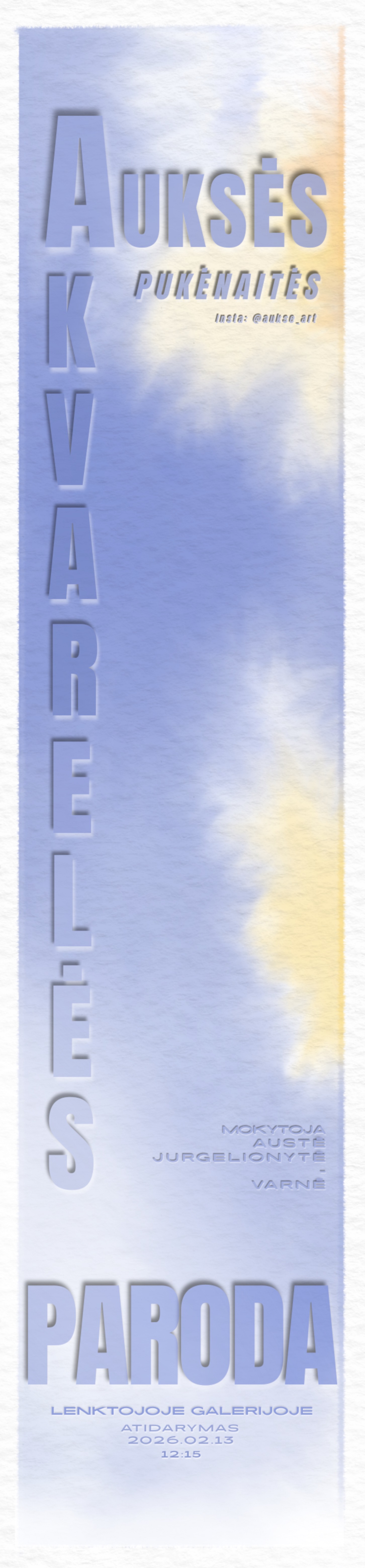Auksės Pukenaitės parodoje „Akvarelės“ eksponuojami darbai, atspindintys penkerių metų kūrybines keliones su akvarele ir jų brandžius rezultatus. Šiais kūriniais kviečiame pasidžiaugti parodoje, vykstančioje Nacionalinės M. K. Čiurlionio menų mokyklos Lenktojoje galerijoje.