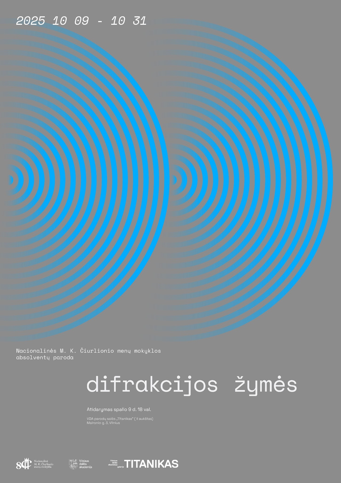 Nacionalinės M. K. Čiurlionio menų mokyklos Dailės skyrius maloniai kviečia į Mokyklos absolventų parodą „DIFRAKCIJOS ŽYMĖS“, kuri veikia Vilniaus dailės akademijos parodų erdvėse „Titanikas“ (Maironio g. 3, Vilnius) II aukšte nuo 2025 m. spalio 9 d.