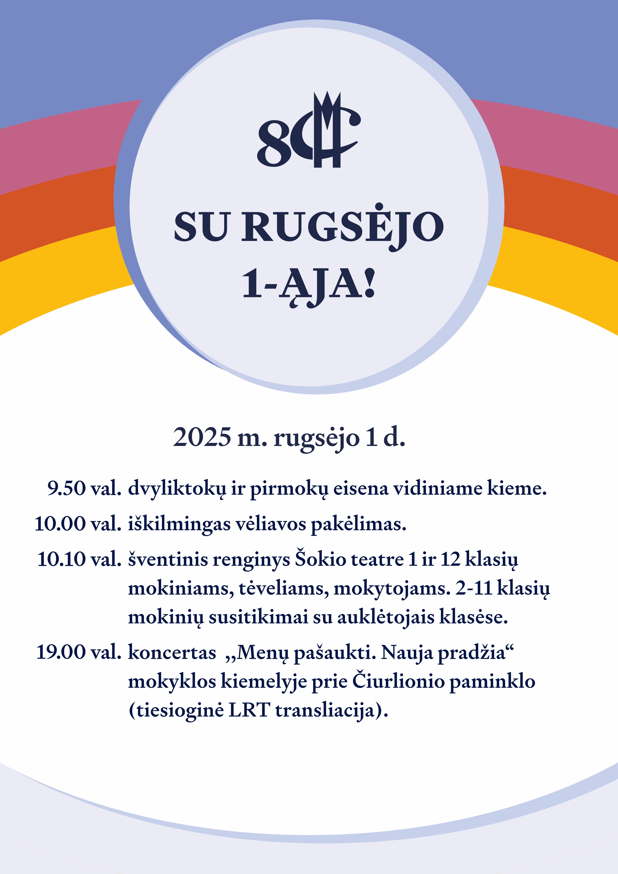 Maloniai kviečiame mokinius, tėvelius ir visą mokyklos bendruomenę kartu pradėti naujus mokslo metus Moklso ir žinių dienos švente 2025 m. rugsėjo 1 d. Nacionalinėje M. K. Čiurlionio menų mokykloje (T. Kosciuškos g. 11). Rugsėjo 1-ąją palinkėkime vieni kitiems darbingų ir sėkmingų metų.